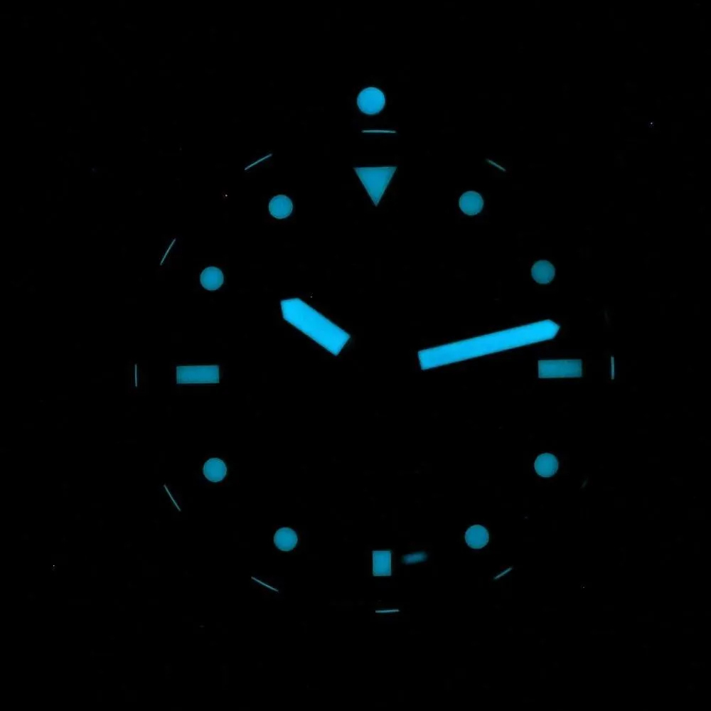 Корпус: Корпус выполнен из высококачественной стали 316L с повышенной устойчивостью к коррози с полировкой до зеркального блеска. Рифленый керамический вращающийся в одном направлении безель чёрного цвета. Градиентный циферблат синего цвета. Часовы метки в виде штрихов и точек, 12-ти часовая метка в виде треугольника. Широкие мечевидные стрелки в стиле Sword. Стрелки и метки с люминесцентным покрытием SuperLuminova, которое светится в темноте после непродолжительной зарядки на свету. Сапфировое стекло с антибликовым покрытием нанесенным с обеих сторон. Завинчивающаяся рифленая заводная головка. Прозрачная задняя крышка. Диаметр корпуса: 43 мм. Водозащита: 300 метров.