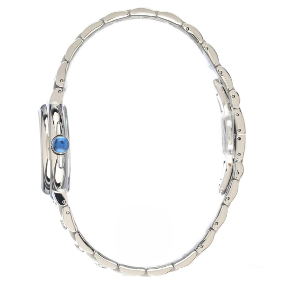 Корпус: Корпус выполнен из высококачественной стали 316L с повышенной устойчивостью к коррозии, поверхность с полировкой до зеркального блеска. Белый перламутровый циферблат украшен кольцом из 46 бриллиантов. Листовидные стрелки в стиле Feuille. Сапфировое стекло с антибликовым покрытием защищает циферблат от царапин и обеспечивает отличную читаемость при любом освещении. Рифленая заводная головка с защитой украшена камнем в форме кабошона. Диаметр корпуса: 32 мм. Водостойкость: 30 метров.