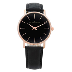 2. Philippe de Cheron Crusader I quartz 1005.1267N Корпус – красное золото 14 карат, общий вес золота – 18 г. Диаметр – 39 мм, толщина – 6 мм. Сапфировое стекло. Механизм кварцевый «Ronda 1012». Циферблат – чёрный, Rayonne, золотые стрелки и часовые метки. Водонепроницаемость 3 атм. (30 м). Чёрный кожаный ремешок. |