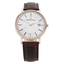 1. Philippe de Cheron Crusader II quartz 1004.1262N Корпус – красное золото 14 карат, общий вес золота – 20,6 г. Диаметр – 40 мм, толщина – 5,5 мм. Сапфировое стекло. Механизм кварцевый «Ronda 1015». Циферблат – серебристый, Clous de Paris, золотые стрелки и часовые метки, окошко даты. Водонепроницаемость 3 атм. (30 м). Коричневый кожаный ремешок. |