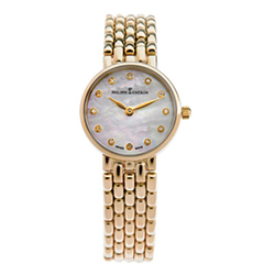 4. Philippe de Cheron Elisa oval quartz 5002.1218N Корпус – жёлтое золото 14 карат, размеры – 21,5x24мм, толщина – 5,5мм. Браслет – жёлтое золото 14 карат. Общий вес золота – 40,2 г. Сапфировое стекло. Водонепроницаемость 3 атм. (30 м). Механизм – кварцевый «Ronda 751». Циферблат – белый, перламутровый, золотые стрелки и 4 бриллианта 0,02 карата в виде часовых меток. |