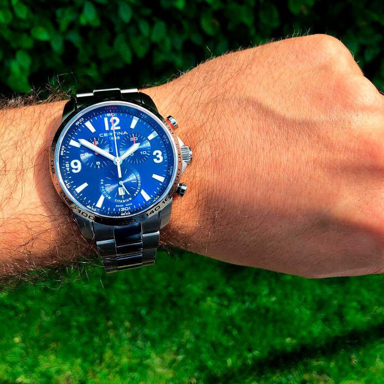 Функции: Центральные часовая, минутная и стрелки секундомера. Хронограф, дата, тахиметр, EOL.