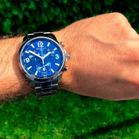 Корпус: Титановый. Синий циферблат. Стрелки и часовые индексы серебристого цвета, покрыты люминесцентным составом. Антибликовое покрытие сапфирового стекла позволяет циферблату быть хорошо читаемым и видимым даже в самые солнечные дни. Диаметр 44 мм. Водозащита 200 м.