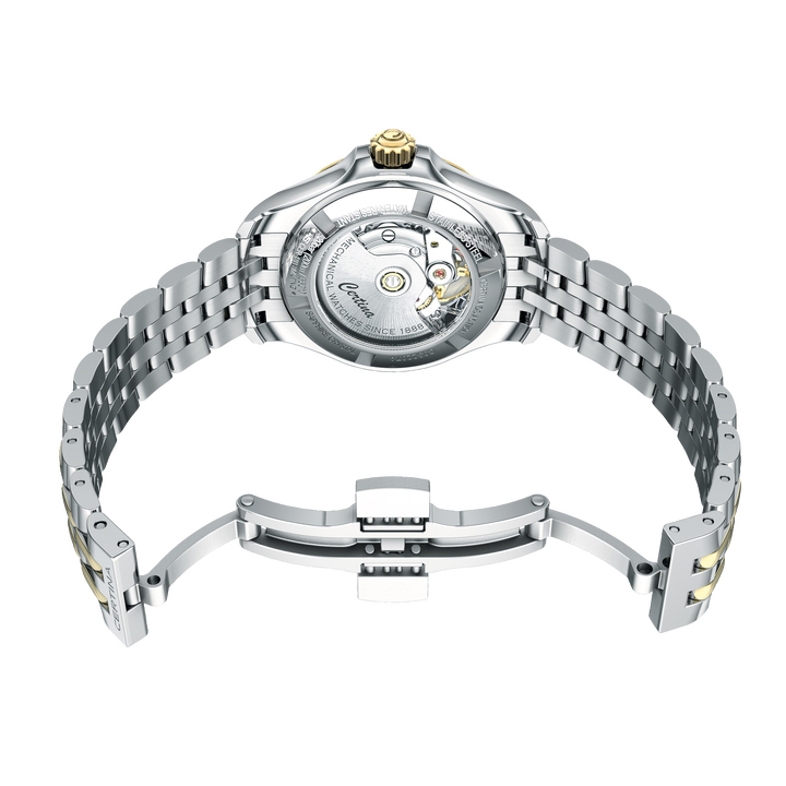 Корпус: Нержавеющая сталь 316L с частичным PVD покрытием. Белый перламутровый циферблат, декорирован 8 бриллиантами Top Wesselton. Стрелки и часовые индексы золотистого цвета. Сапфировое стекло с односторонним антибликовым покрытием. Диаметр 34,5 мм. Водозащита 200 м.