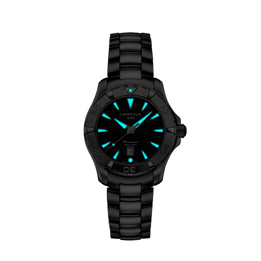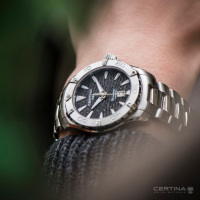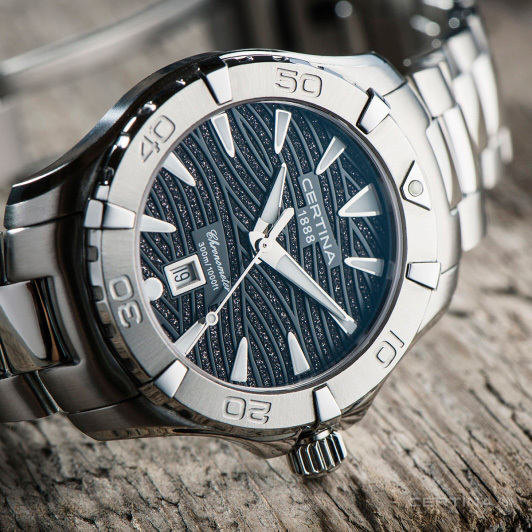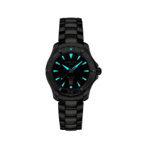 Корпус: Корпус из нержавеющей стали. Сапфировое стекло с антибликовым покрытием. Черный переливающийся циферблат, стальные стрелки и часовые индексы. Вращающийся безель. Диаметр 34,3 мм. Водонепроницаемость 300 метров.