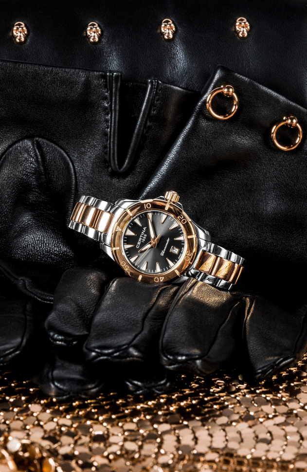 Корпус: Корпус из нержавеющей стали с PVD покрытием. Сапфировое стекло с антибликовым покрытием. Графитовый циферблат, позолоченные стрелки и часовые индексы. Вращающийся безель. Диаметр 29 мм. Водонепроницаемость 200 метров.