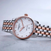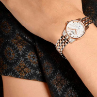 Корпус:  Корпус из полированной/матовой нержавеющей стали с частичным PVD - покрытием. Антибликовое покрытие сапфирового стекла. Перламутровый цифербла с узором. Водостойкость: 100 м. Диаметр: 27,5 мм.