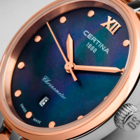 Корпус: Корпус из полированной/матовой нержавеющей стали с частичным PVD - покрытием. Антибликовое покрытие сапфирового стекла. Циферблат-темный перламутр. Водостойкость 100 м. Диаметр 27,5 мм.