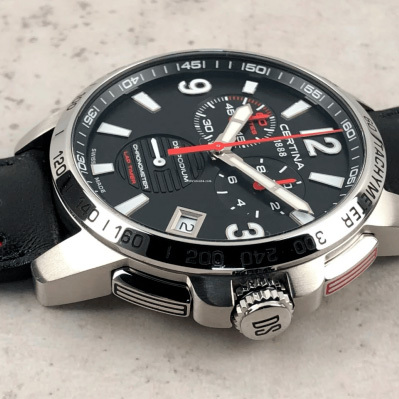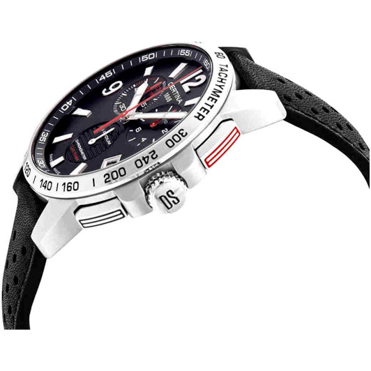 Функции: Индикация часов, минут при помощи центральных стрелок. Маленькая секундная стрелка в позиции "6 часов". Дата в положении "4 часа". Хронограф. Тахиметр.