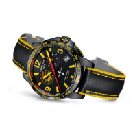 Корпус: Нержавеющая сталь + PVD покрытие черного цвета. Желтые цифры, метки и стрелки с люминисцентным светонакопителем. Сапфировое стекло с антибликовым покрытием. Черный циферблат. Диаметр 42 мм. Водонепроницаемость 100 метров.