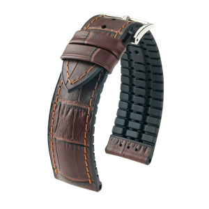 Описание: Лучшая итальянская телячья кожа Toscana с естественно выглядящим тиснением под аллигатора, полуматовая с характерным двухтоновым эффектом. Сердцевина HIRSCH Premium Caoutchouc (черный каучук). Благодаря специальной рифленой подкладке обеспечивается постоянная циркуляция воздуха и незамедлительное отведение воды и пота, создавая так называемый "эффект сухой кожи". Подчеркнутая запатентованная прошивка. Интегрированный фиксатор ремешка. Цвет - коричневый. WR-300.