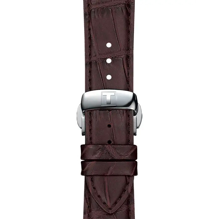 Ремешок: Коричневый кожаный ремешок в стиле аллигатора с классической пряжкой.