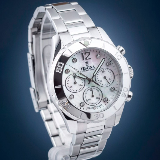 Ремешок: Надежный стальной браслет с раскладывающейся застежкой, которая украшена фирменным логотипом Festina.