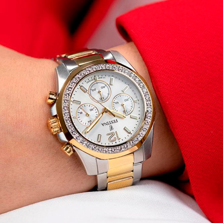 Ремешок: Надежный, прочный и элегантный браслет из нержавеющей стали с частичным PVD. Застежка украшена фирменным логотипом Festina, на кнопочной фиксации.