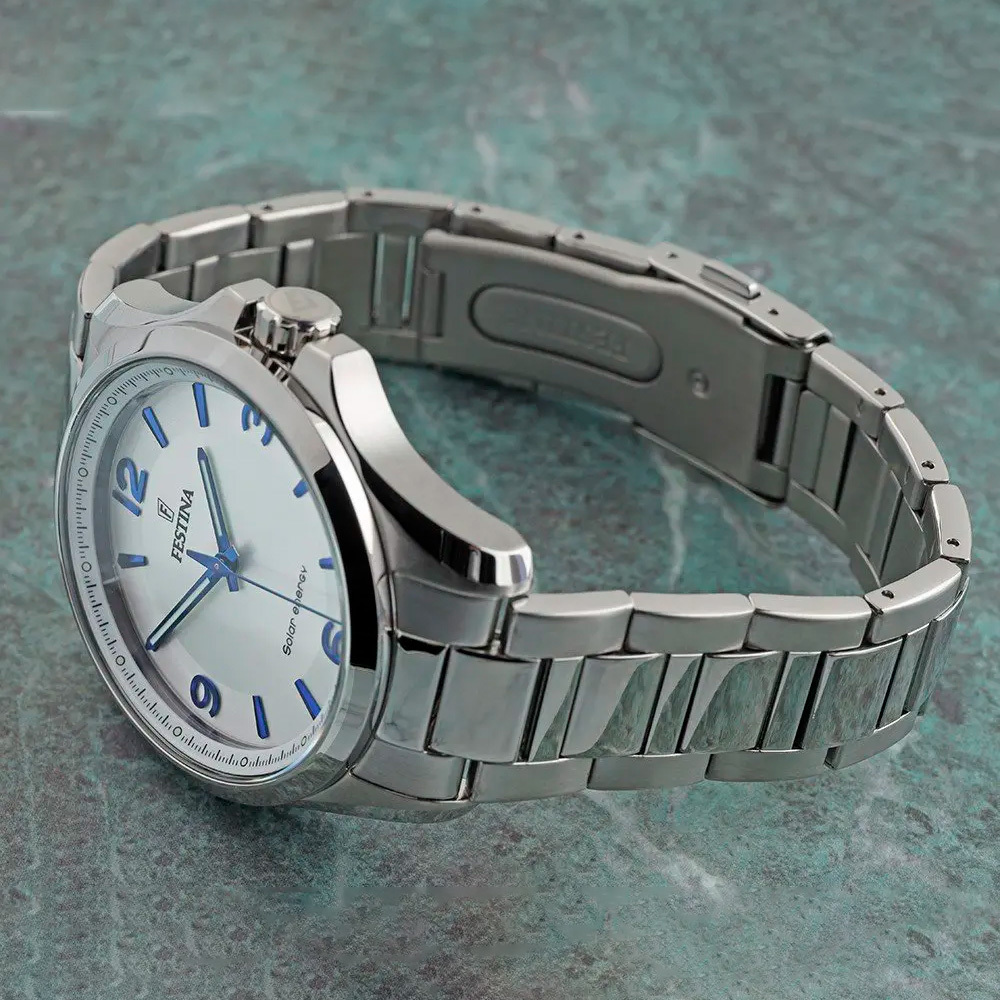 Ремешок: Надежный стальной браслет с раскладывающейся застежкой, которая украшена фирменным логотипом Festina.