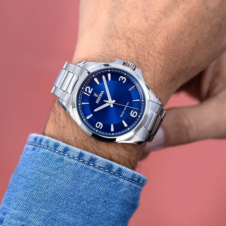 Корпус: Наручные часы Festina в корпусе из нержавеющей стали 316L. Синий циферблат защищён от внешнего воздействия минеральным стеклом. Метки в виде штрихов и арабских цифр. Рифленая заводная головка. Водозащита корпуса 5 АТМ обеспечивает гарантированную защиту во время мытья рук или в дождь. Диаметр 41,5мм, толщина 10,13мм.