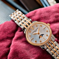 Корпус: Нержавеющая сталь с частичным PVD-покрытие из розового золота. Сапфировое стекло. Перламутровый циферблат с золотистыми стрелками, украшен 8-ю бриллиантами. Водозащита 30 метров. Диаметр 30 мм.