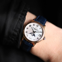 Функции: Центральные часовая, минутная и секундная стрелки, индикация даты. Фигурная апертура в нижней части циферблата открывает указатель фазы Луны.