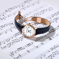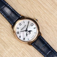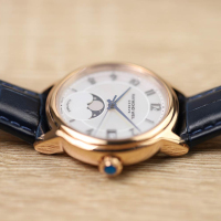 Корпус: Корпус круглой формы выполнен из нержавеющей стали марки 316L с PVD-покрытием цвета розового золота. Циферблат из натурального перламутра, метки в виде арабских цифр. Сапфировое стекло имеет повышенную устойчивость к возникновению царапин. Прозрачная задняя крышка с сапфировым стеклом. Рифленая заводная головка украшена синим лаком. Диаметр корпуса 34 мм, толщина 9,4 мм. Водостойкость на глубине до 50 метров.