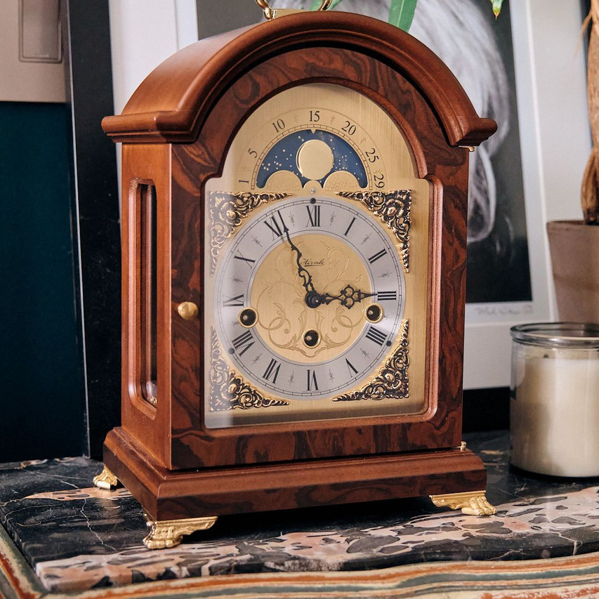 Материал: Настольные часы, сделаны из отборной древесины. Красивый металлический циферблат с латунной отделкой углов и лунным календарем. Модель имеет латунную ручку и застекленные боковые стороны корпуса.