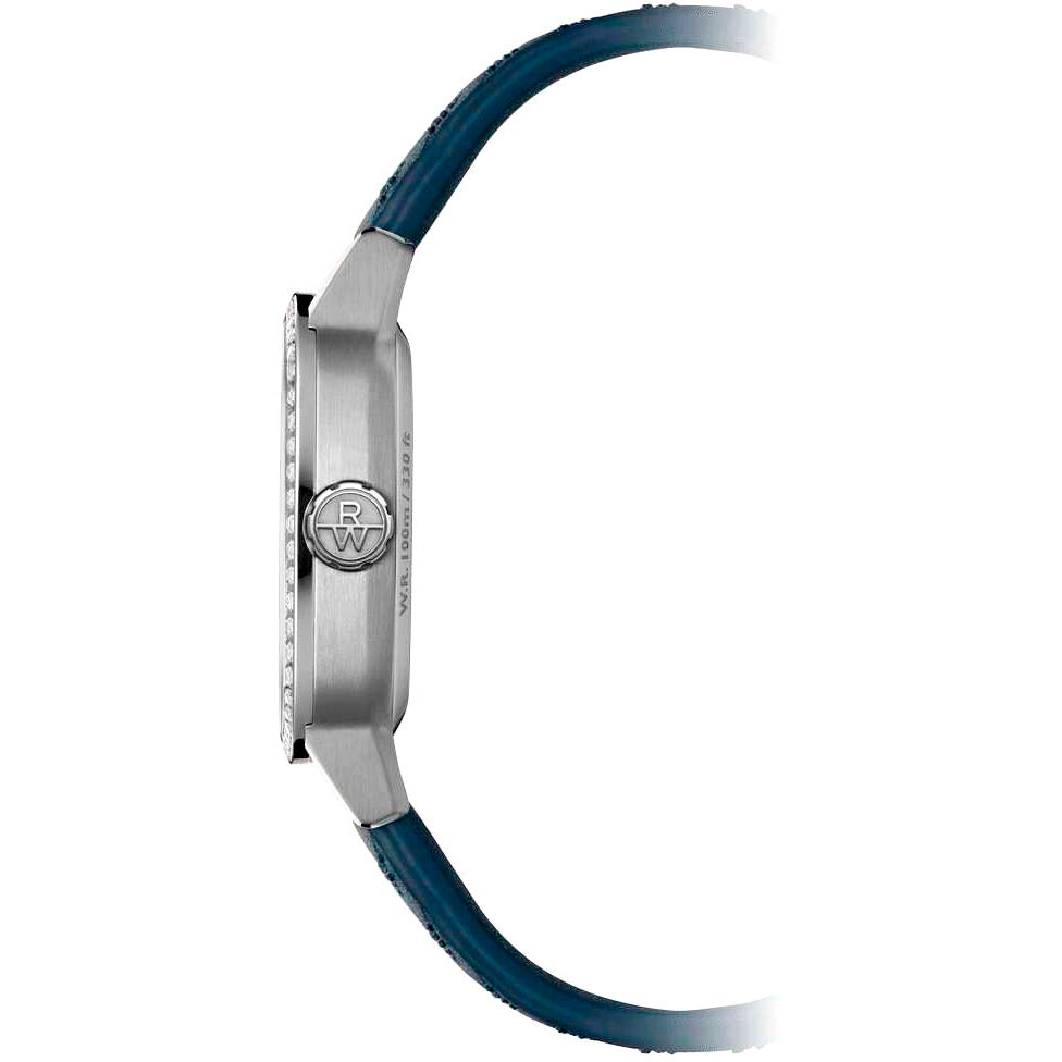 Корпус: Квадратный корпус в форме «подушки» изготовлен из полированной нержавеющей стали и украшен 60 искусственными бриллиантами 0,399К. Циферблат c синим градиентом и гильоше в центре, мотивом которого послужила фирменная буква «W». Накладные метки в виде штрихов и стрелки с люминесцентным покрытием SuperLuminova, которое светится в темноте после непродолжительной зарядки на свету. Устойчивое к возникновению царапин сапфировое стекло с антибликовым покрытием с двух сторон. Прозрачная задняя крышка с сапфировым стеклом. Заводная головка украшена монограммой RW. Размер корпуса 34,5х34,5мм, толщина 9,3мм. Водозащита 100 метров.