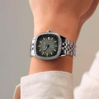 Корпус: Квадратный корпус в форме «подушки» изготовлен из полированной нержавеющей стали и украшен 60 искусственными бриллиантами 0,399К. Циферблат c зелёным градиентом и гильоше в центре, мотивом которого послужила фирменная буква «W». Накладные метки в виде штрихов и стрелки с люминесцентным покрытием SuperLuminova, которое светится в темноте после непродолжительной зарядки на свету. Устойчивое к возникновению царапин сапфировое стекло с антибликовым покрытием с двух сторон. Прозрачная задняя крышка с сапфировым стеклом. Заводная головка украшена монограммой RW. Размер корпуса 34,5х34,5мм, толщина 9,3мм. Водозащита 100 метров.