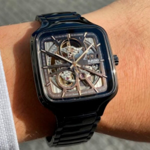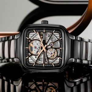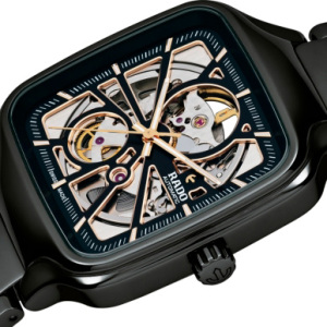 Корпус: Высокотехнологичная керамика чёрного цвета квадратной формы с корпусом моноблок. Скелетонированный циферблат чёрного цвета, золотистые стрелки и часовые индексы с люминесцентным покрытием. Сапфировое стекло с антибликовым покрытием. Прозрачная задняя крышка из сапфирового стекла. Водозащита 50 м. Размер 38 x 38 мм, толщина 9,7 мм.
