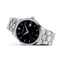 Корпус: Корпус из нержавеющей полированной стали. Чёрный циферблат с серебристыми стрелками и рисками. Сапфировое стекло. Диаметр 40 мм. Водозащита 50 м.