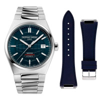 Ремешок: Браслет с литыми звеньями из нержавеющей стали, пружинная система быстрой замены ремешка/браслета, браслетная застежка тройного сложения “бабочка” раскладывается при нажатии на кнопки двойной фиксации. В комплекте идет каучуковый ремешок синего цвета с тиснением.