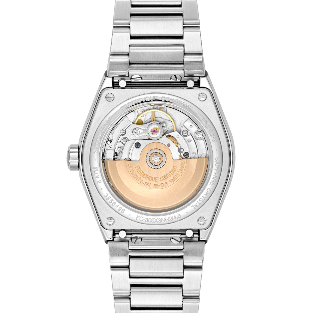 Механизм: Швейцарский механизм FC-303 с автоматическим подзаводом создан имеет запас хода 38 часов, частота колебаний баланса 28 800 пк/час (4Hz), 26 рубинов в качестве камневых опор колесной системы и палет анкерного спуска. Точность хода механизма часов линейки отрегулирована в соответствии с сертификатом C.O.S.C.