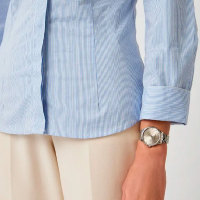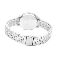 Корпус: Круглый корпус выполнен из полированной нержавеющей стали. Циферблат с метками в виде точек из фианитов и римскими цифрами 6 и 12 выполнен по технологии Sunray (солнечные лучи). Минеральное стекло с сапфировым покрытием. Диаметр корпуса составляет 34 мм, толщина 7 мм. Водостойкость WR 30 (мытье рук, дождь).