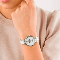Корпус: Круглый корпус выполнен из полированной нержавеющей стали. Метки в виде точек на перламутровом циферблате белого цвета. Минеральное стекло с сапфировым покрытием. Диаметр корпуса составляет 34 мм, толщина 7 мм. Водостойкость WR 50 (мытье рук, дождь).
