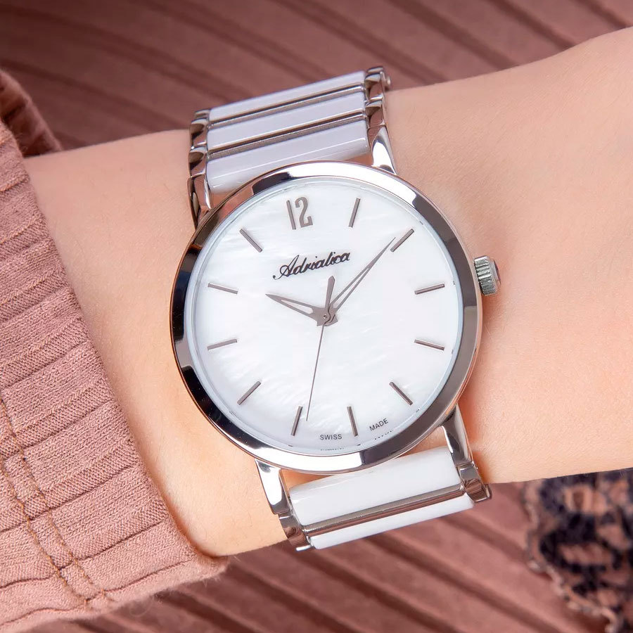 Корпус: Круглый корпус выполнен из полированной нержавеющей стали. Белый перламутровый циферблат. Накладные часовые метки и стрелки выполнены из стали. Минеральное стекло. Диаметр корпуса составляет 36 мм, толщина 7 мм. Водостойкость WR 30 (мытье рук, дождь).