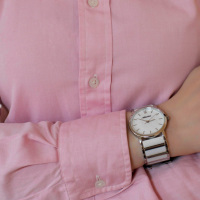 Ремешок: Браслет выполнен из нержавеющей стали с белыми керамическими вставками. Раскладывающаяся застежка с гравировкой логотипа.