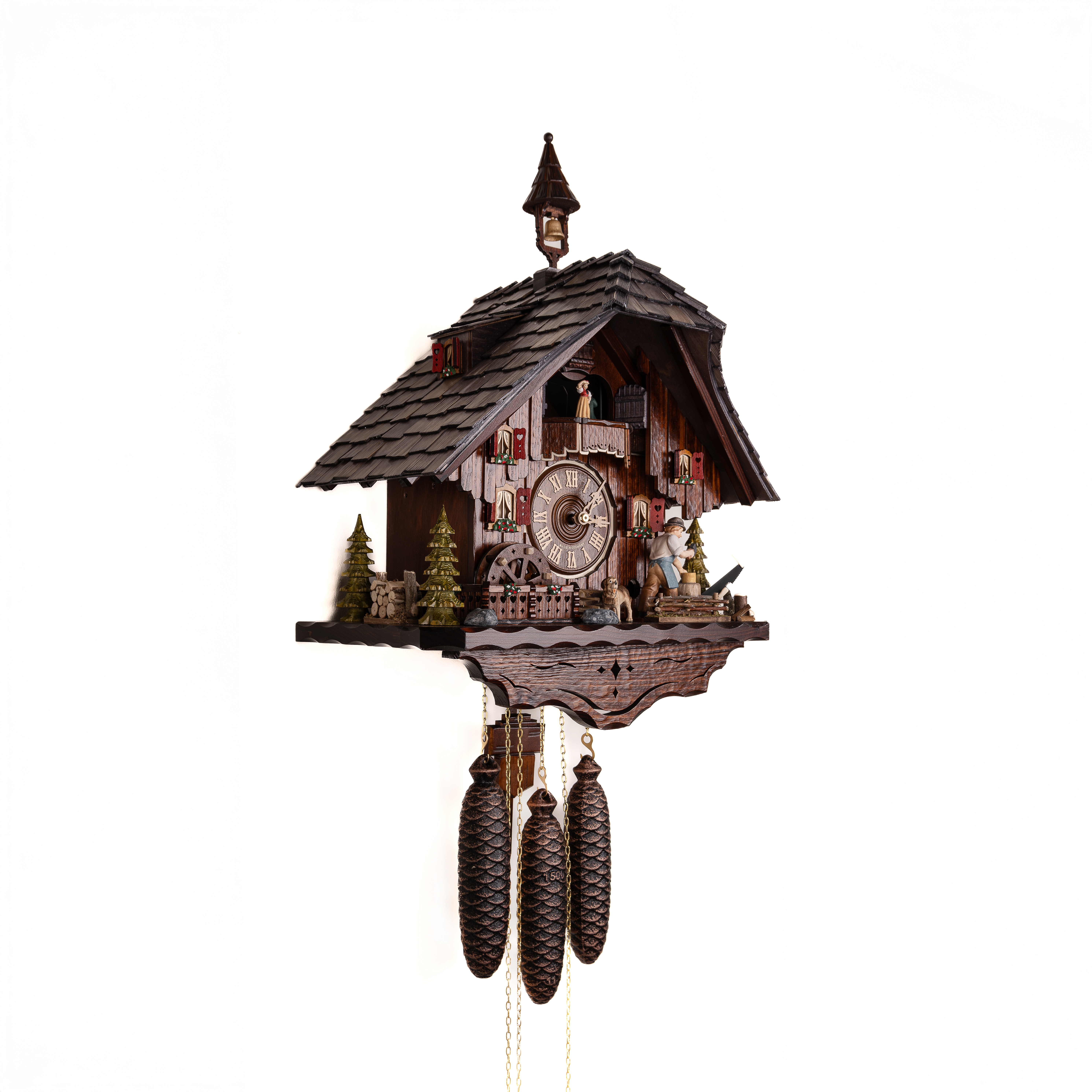 Механизм: Механические часы с кукушкой, которые работают от гирь на цепной тяге. Сделан механизм на фирме SBS-Feintechnik GmbH & Co. KG Германия. Шварцвальдский дом с подвижным дровосеком, мельничным колесом и танцующими парами на балконе. Запас хода на 8 дней. Ручное отключение звука. В каждые пол часа кукушка появляется из своего домика, наклоняется и воспроизводит звук кукушки (ку-ку) один раз, в каждый полный час она кукует столько раз сколько показывают стрелки на часах. После этого на балкончике начинают кружиться в танце деревянные фигурки под музыку (2 мелодии чередуются). Одна гиря в данных часах отвечает за ход часового механизма, вторая за механизм кукушки, а третья за воспроизведение музыки, как в музыкальной шкатулке и движение танцующих фигурок на балконе.