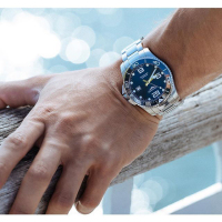 Корпус: Нержавеющая сталь, водонепроницаемость 300 метров, стекло сапфировое. Диаметр 44,0мм. Циферблат синий и синий вращающийся безель.