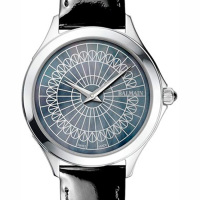 Корпус: Нержавеющая сталь. Циферблат перламутровый, черный. Необычный рисунок циферблата защищен высокопрочным сапфировым стеклом. Заводная головка с защитой, украшена камнем в форме кабошона. Диаметр 33,6 мм. Водостойкость 50 м.