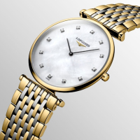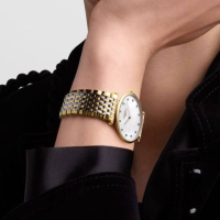Корпус: Нержавеющая сталь + PVD-покрытие из жёлтого золота, сапфировое стекло, 12 бриллиантов на циферблате. Размер 33 мм, водонепроницаемость 30 метров. Циферблат – перламутровый белый.