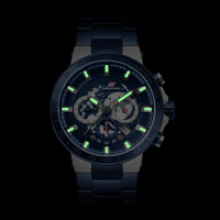 Корпус: Корпус выполнен из нержавеющей стали AISI 304, придающей часам особую прочность и стойкость от повреждений с IP покрытием безеля, кнопок фронографа и заводной головки. Часовые индексы и стрелки с покрытием SuperLuminova, которое обеспечивает подсветку в темное время суток. Циферблат синего цвета защищен упрочненным минеральным стеклом Hardlex(разработанным компанией Seiko Watch Corporation, которое обладает высокой устойчивостью к ударам и царапинам, около 7 баллов по шкале Мооса). Диаметр: 45 мм. Водонепроницаемость: 100 м.