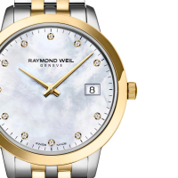 Ремешок: Модель на браслете с 5 рядами литых звеньев из высококачественной стали с частичным PVD - покрытием. Браслетная застежка, раскладывающаяся при нажатии на кнопки с двойной системой блокировки, украшена гравировкой Raymond Weil.