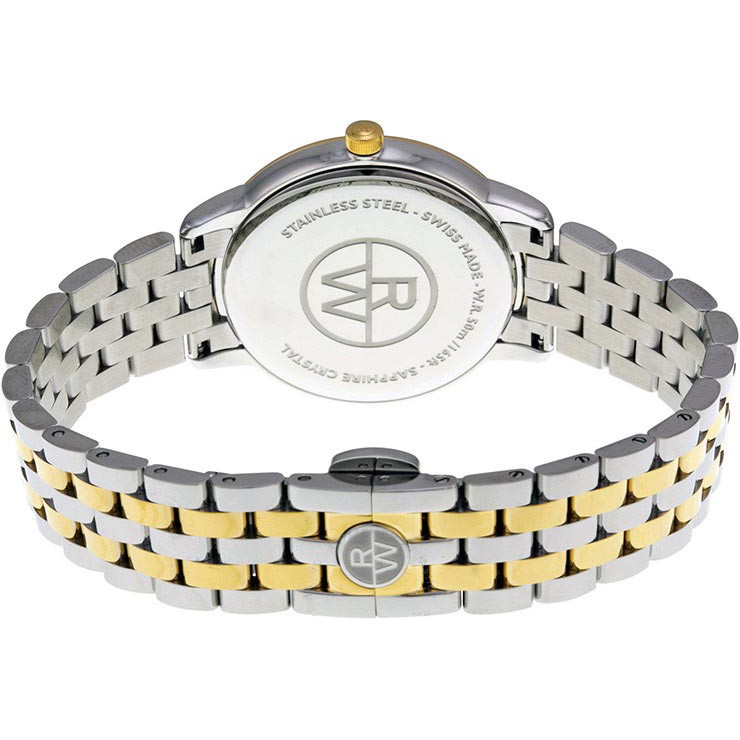 Корпус: Корпус круглой формы выполнен из нержавеющей стали марки 316L с частичным PVD - покрытием. Белый перламутровый циферблат украшен в качестве часовых индексов инкрустацией 11 бриллиантов 8/8 - SI2 - SI1, общим весом 0,04 карата, граненые стрелки имеют покрытие цвета золота. Сапфировое стекло имеет повышенную устойчивость к возникновению царапин. Переводная коронка украшена логотипом RW. Задняя крышка крепится к корпусу при помощи пресса. Диаметр: 34 мм. Водостойкость 50 метров (165 ft / 5 АТМ).