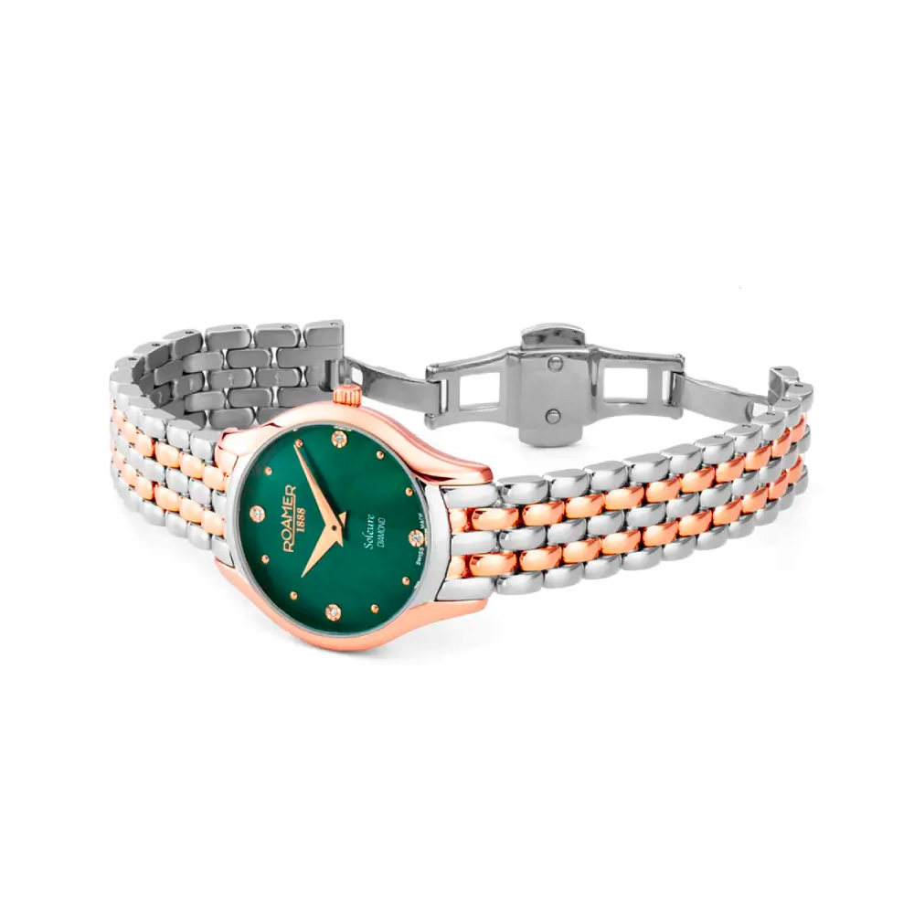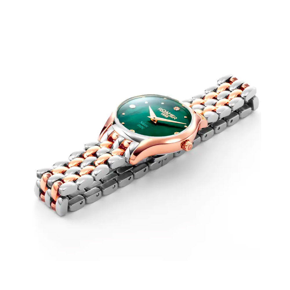 Корпус: Корпус выполнен из высококачественной нержавеющей стали 316L, с частичным IP покрытием. Перламутровый циферблат зелёного цвета декорирован бриллиантами, золотистые стрелки и часовые индексы. Сапфировое стекло с антибликовым покрытием. Диаметр: 30 мм. Водозащита: 30 м.