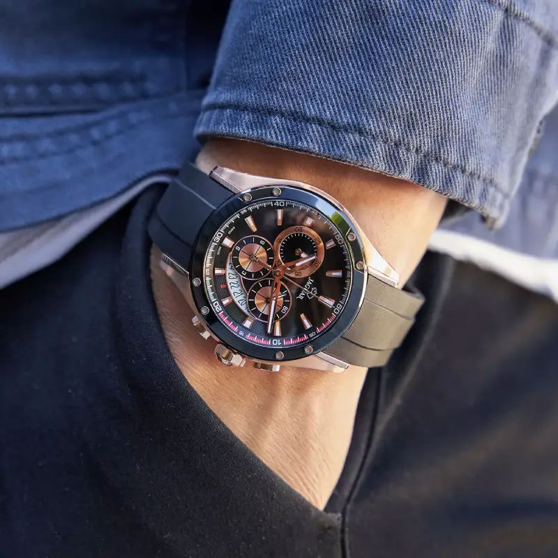 Ремешок: Эти часы оснащены черным каучуковым ремешком с двойной кнопочной застежкой, которая позволяет легко открывать и закрывать ремешок, минимизируя его толщину на нижней стороне запястья. Дополнительно в комплете чёрный кожаный рмень.