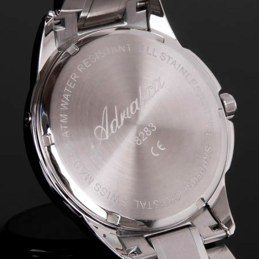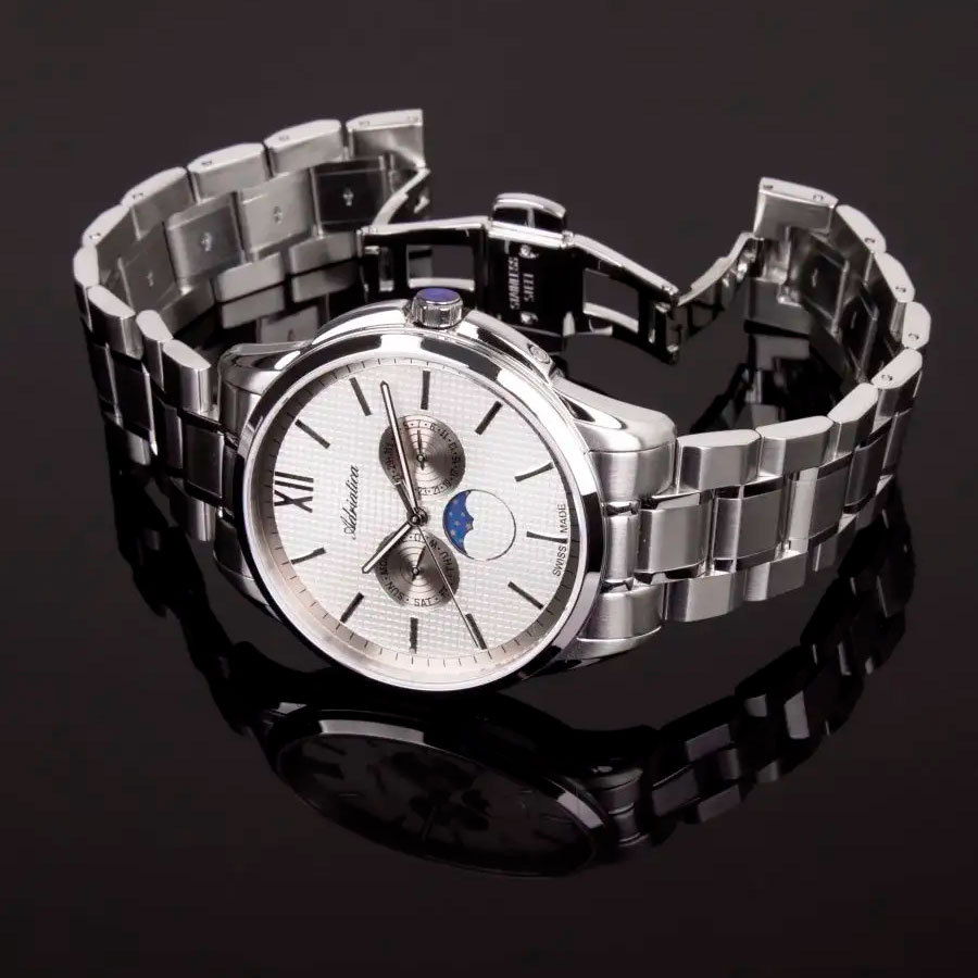 Функции: Центральные часовая, минутная и секундная стрелки. Индикатор фазы Луны. День недели и число отображаются на отдельных циферблатах.