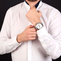 Корпус: Корпус выполнен из высококачественной стали с повышенной устойчивостью к коррозии, поверхности с матовой шлифовкой – сатинированием и полировкой до зеркального блеска. Серебристый циферблат с узором гильоше. Накладные часовые индексы и стрелки выполненый из стали. Стрелки с покрытием SuperLuminova, которое обеспечивает подсветку в темное время суток. Сапфировое стекло устойчивое к возникновению царапин. Диаметр корпуса составляет 45 мм, толщина 10 мм. Водостойкость WR 50 (мытье рук, дождь).