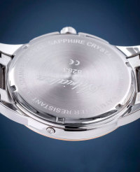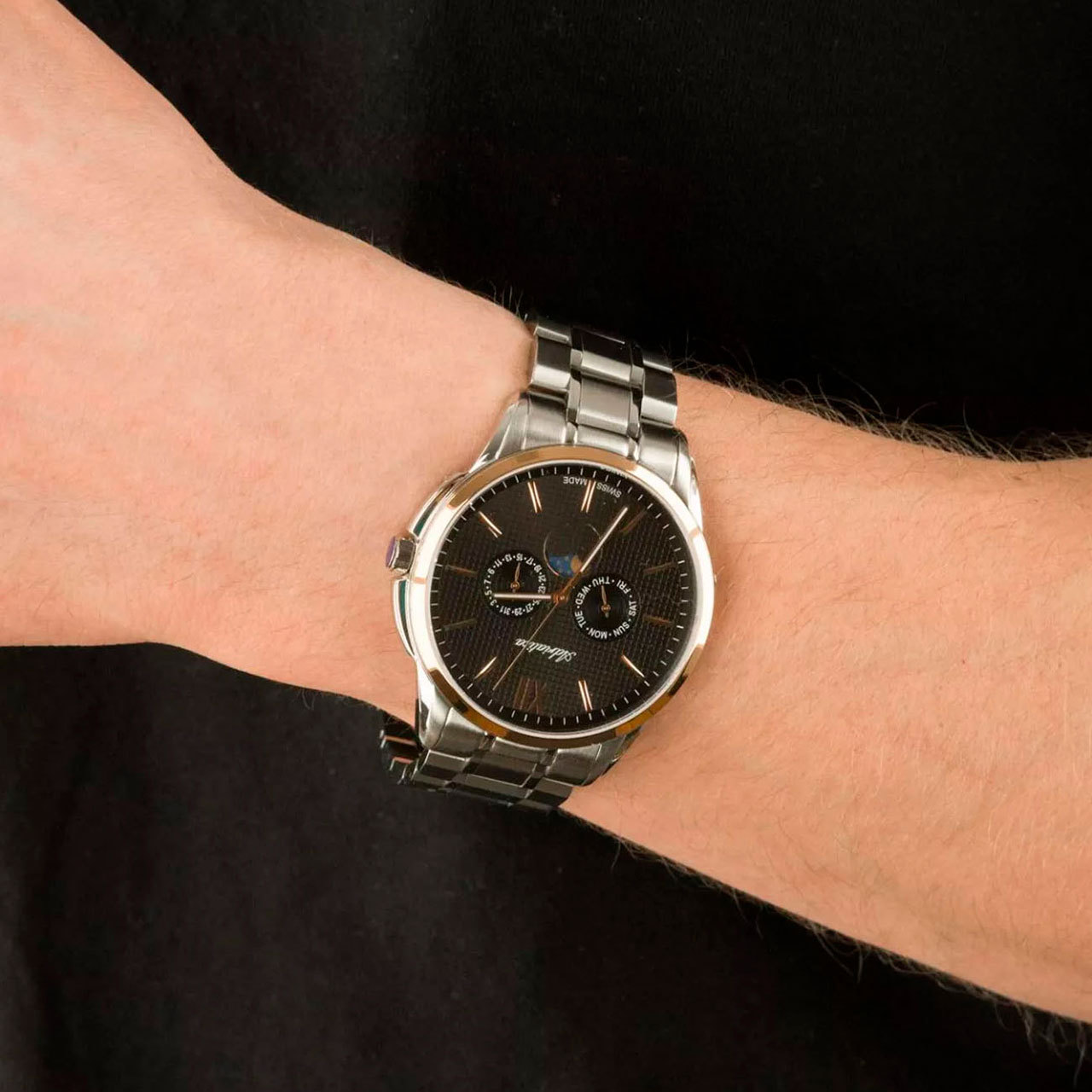 Функции: Центральные часовая, минутная и секундная стрелки. Индикатор фазы Луны. День недели и число отображаются на отдельных циферблатах.
