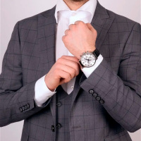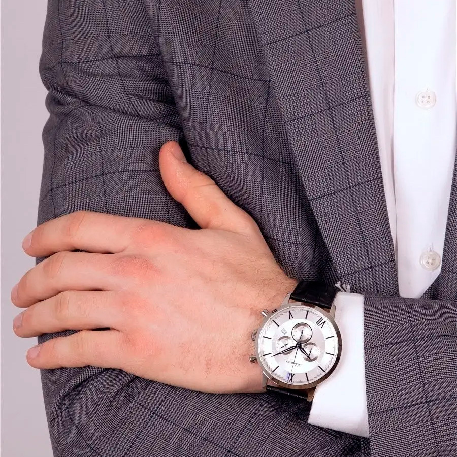 Функции: Центральные часовая и минутная стрелки, секундная стрелка вынесена на отдельный циферблат. Дата. Хронограф.