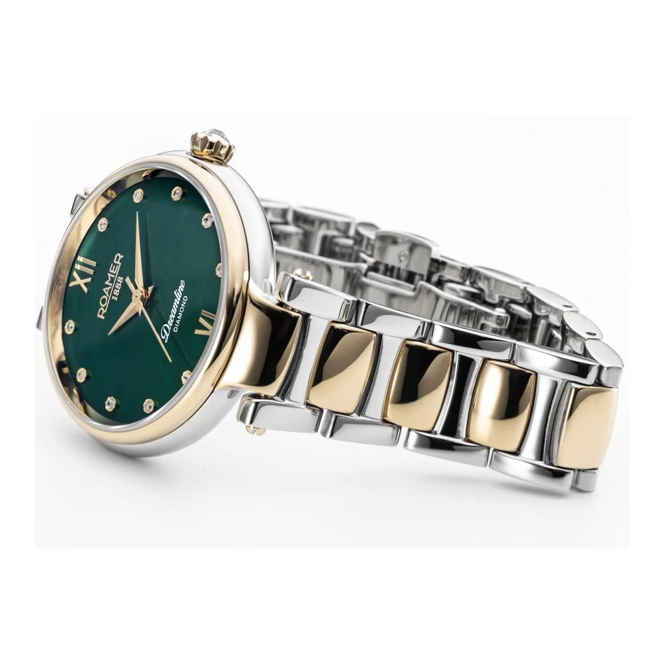 Корпус: Круглый корпус выполнен из нержавеющей стали 316L с частичным IP покрытием цвета жёлтого золота. Перламутровый зелёный циферблат. Метки в виде точек. Устойчивое к возникновению мелких механических повреждений сапфировое стекло. Диаметр корпуса составляет 33 мм. Водостойкость WR 50 м.