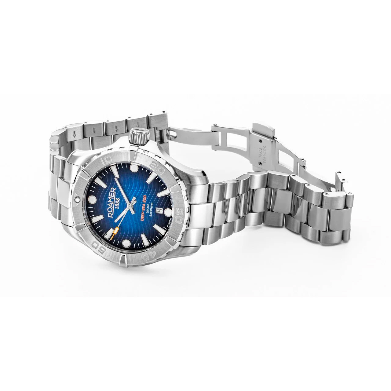 Корпус: Нержавеющая сталь, вращающийся безель. Синий циферблат с волнистой текстурой . Серебристые стрелки и часовые индексы с люминесцентным покрытием. Сапфировое стекло с антибликовым покрытием. Водонепроницаемость: 200 метров. Диаметр: 43 мм.