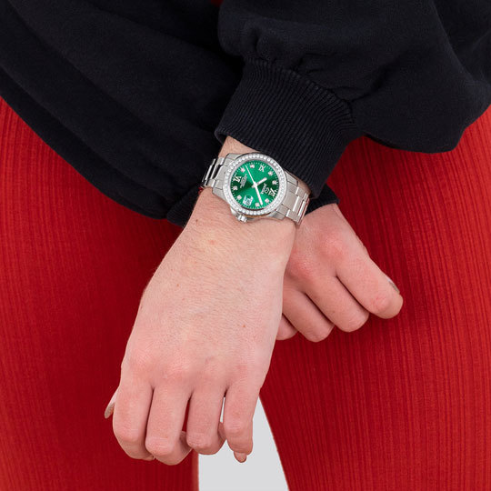 Корпус: Корпус изготовлен из нержавеющей стали 316L, устойчивой к коррозии, отличающейся высокой прочностью и устойчивостью к царапинам. Зелёный циферблат со стальными стрелками обеспечивает идеальную читаемость. Безель и циферблат украшены цирконами. Сапфировое стекло с антибликовым покрытием, обладает повышенной устойчивостью к возникновению царапин. Диаметр корпуса 34,5 мм, толщина 11,0 мм. Водостойкость 200 метров, завинчивающаяся заводная коронка.